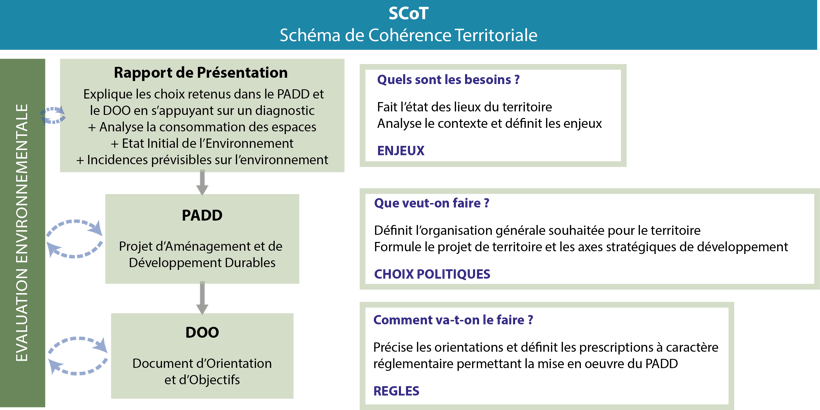 Le SCoT est composé de 3 grandes parties dont le contenu est défini dans le code de l'urbanisme, à savoir :