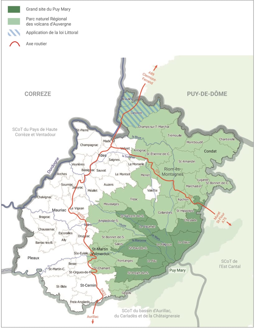 Le Syndicat regroupe les 4 communauté de communes du pays Gentiane, du pays de Mauriac, du pays de Salers et de Sumène Artense, soit un périmètre d'étude comprenant 71 communes.